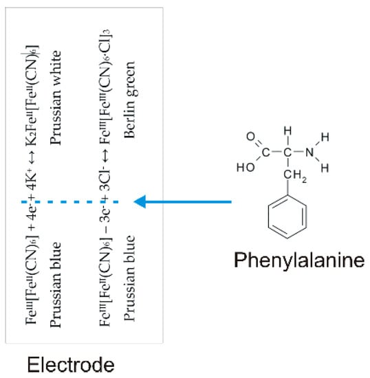 Meldola’s Blue, Cobalt Phthalocyanine and Prussian Blue are electroactive compounds of interest for the development of sensors. An electrode modified with Meldola’s Blue was used in the development of biosensors based on dehydrogenase, due to its ability to mediate the oxidation of nicotinamide adenine dinucleotides [37,38,39,40,41,42,43]. Cobalt Phthalocyanine, an organic semiconductor ensuring sensor stability and sensitivity is another modifier used in the development of CMEs [44,45,46,47]. Due to its chemical composition, Prussian Blue has very good electrochemical properties, being most frequently used in the manufacture of electrochemical (bio)sensors detecting hydrogen peroxide [48,49,50,51,52,53,54,55,56]. These electroactive materials could be used for the development of novel electrochemical sensors for different analysts of great importance such is Phe.