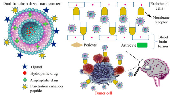 The brain is the most vital and amazing three-pound organ protected within the skull and is responsible for regulating memory, sensitive motor functions and many other processes and is composed of the cerebrum, cerebellum and brain stem as well as four lobes (frontal, parietal, occipital and temporal). The cerebellum is the largest part of the brain, accompanying right and left hemispheres performing higher sensory and motor functions as well as controlling movements; it is accompanied with the cerebrum, functionalized for muscle, posture and movement coordination. However, the cerebellum and cerebrum are connected to the spinal cord via the brain stem, located under the cerebrum. It performs many automatic functions. Moreover, the significant four lobes of the brain are linked with proper propagation of behavioral functions [1]. However, any malfunction in the anatomical structure of the brain and abnormal growth of cells in an uncontrolled manner leads to disruption in the normal functional capabilities of the brain [2]. According to the statistics of the National Brain Tumor Society in 2016, approximately 78,000 people are diagnosed and 16,616 people die from malignant brain tumors in the USA every year [3]. Abnormal growth of mass cells can be static and metastatic, leading to the development of benign and malignant cancers [4]. Brain tumors are associated with increased intracranial pressure, headaches, vomiting, altered consciousness and seizures. Moreover, brain tumors can be further elaborated and classified according to their growth and location in the respective brain cells [5]. The most common site for brain tumor invasion is in brain glial cells [6]. Brain glial cells can be further classified into four grades (grade 1 to grade IV) by the WHO guidelines [7]. Grades I and II are termed as low-grade tumors and grades III and IV are classified as higher-grade tumors [8]. Metastatic brain tumor development is more common in adults than children [9]. Moreover, lung cancer in males and breast cancer in females propagates towards brain tumor metastasis [10]. Etiological causes of brain cancer are still unidentified. Metastatic brain cancer (tumor) treatment requires crucial medication parameters of non-chemotherapeutics, chemotherapeutics, radiation and surgical techniques [11]. Non-chemotherapeutic drugs are preferred to relieve tumor-associated headache and epileptic seizures [12,13]. However, chemotherapeutic drugs help in mitigating tumor mass and edema as well as killing cancer cells [14]. Similarly, radiation therapy can be used to circumvent mass of brain tumors via precise, focused beams that target the tumor while sparing the surrounding brain [15,16,17]. A combination of four drugs (lomustine, temozolomide, procarbazine and vincristine) has been used along with radiation therapy [18]. However, combination of all treatments regarding brain cancer is exceptionally challenging, as the blood–brain barrier (BBB) offers a great barrier towards successful drug delivery into the central nervous system. Furthermore, it is difficult to target for anti-cancer drugs because of its complex anatomical structure and physiology for protection of the central nervous system (CNS). The BBB is a prime factor responsible for maintaining the flow of essential electrolytes and cells between blood and the brain, for maintaining the homeostasis of the CNS and shielding neural cells and tissues from pathogenic toxins and is selective in the uptake of certain drugs via lacking fenestrations for transport of drugs of a large size [19,20]. Regrettably, all the therapeutics designed to target brain cancer are challenging and lack targeted delivery also because of their large size [21,22]. Moreover, the complicated structure of the BBB is attributed to the special brain mitochondrial cells, efflux transporters and tight junctions and results in lowering the bioavailability of chemotherapeutic drugs and narrowing the therapeutic window [23,24,25].