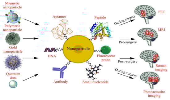 Nanotechnology not only improves drug delivery to diseases but also holds potential in the accurate imaging of the malignant tissues in the brain. NPs comprising biocompatible materials possess ideal physical properties, such as surface chemistry, topology, morphology, solubility, stability, etc., making them a suitable candidate to be used as image contrast structures [141]. Numerous NPs have been evaluated in the past to improve bio-distribution, accumulation in the target tissues and elimination from body. Their nano-dimension not only prolongs the circulation time but also improves the safety profile, if biocompatible nanomaterials are utilized [142]. Nanodiagnostics attenuate the signaling frequency in brain cancers and tumors as a result of phagocytosis by cells in the brain tumor due to leaky vasculature. NPs have enhanced permeation and retention in tumor-associated cells and macrophages, allowing the sharp imaging of malignant tissues, separating them from normal cells [143]. Interesting approaches are being explored to revolutionize the medical diagnosis of malignant tissues. One such technique is modulating the nanostructure’s tropism by using specific coatings of peptides, bio-conjugates and nucleotides for high-precision sensing of the malignancies [144].