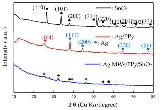 Figure 2 plots the XRD spectra of the pristine SnO2, standalone Ag/PPy and Ag MWs/PPy/SnO2 ternary composites that were prepared by one-step UV-induced photopolymerization processes. The XRD patterns of pristine SnO2 included main peaks at 2θ = 26°, 33°, 37°, 51°, 54°, 65°, 66°, 71°, and 78°, corresponding to the (110), (101), (200), (211), (220), (112), (301), (202), and (321) planes of tetragonal phase SnO2, indicating the formation of SnO2 crystals [,]. For the XRD patterns of Ag/PPy, a broad diffraction peak (104) appears at 24°, revealing the formation of amorphous PPy []. Another four sharp diffraction peaks at 2θ = 38°, 44°, 64°, and 77°, corresponded to the (111), (200), (220), and (311) planes of Ag, indicating the face centered cubic (FCC) structure of Ag []. XRD patterns of Ag MWs/PPy/SnO2 ternary composite had the main characteristic peaks of pristine SnO2 and standalone Ag/PPy, respectively, albeit with relatively low intensities, indicating the simultaneous existence of SnO2, PPy, and Ag in the ternary composites.