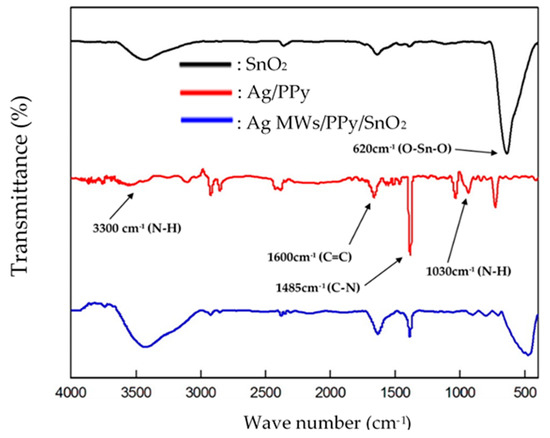 Figure 3 plots the IR spectra of the pristine SnO2, standalone Ag/PPy and Ag MWs/PPy/SnO2 ternary composites that were prepared by one-step photopolymerization processes. For IR spectrum of pristine SnO2, the band at 620 cm−1 was observed, corresponding to the anti-symmetric and symmetric vibrations of Sn–O–Sn []. For IR spectrum of standalone Ag/PPy, the characteristic N-H stretching, C=C stretching, C-N stretching, and N-H bands of PPy corresponding to at 3300, 1600, 1485, and 1030 cm−1 were observed []. IR spectrum of Ag MWs/PPy/SnO2 ternary composite exhibited the main characteristic absorption peaks of pristine SnO2 and standalone Ag/PPy, respectively, providing direct evidence that PPy and SnO2 were present in the Ag MWs/PPy/SnO2 ternary composite.
