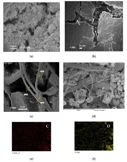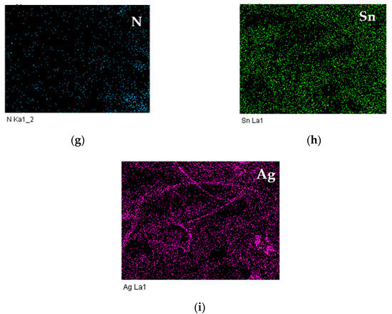 Figure 4a shows the pristine SnO2 film, the SnO2 particles were micro-spherical agglomerates with sizes ranging from 0.1 to 1 μm. Moreover, these particles obviously aggregated to form various unfixed shapes of massive lamination films. Figure 4b shows Ag MWs/PPy/SnO2 ternary composite film in low-magnification image, the PPy glued the SnO2 particles together and formed on the surface of Ag MWs/PPy/SnO2 ternary composite film. Notably, lots of wires were observed from the fracture of image marked by white arrows. Figure 4c shows the high-magnification image of the fracture of image of Figure 4b, the wires with diameters ranging from 0.22 μm to 0.25 μm were embedded and wrapped and more dispersed inside the Ag MWs/PPy/SnO2 ternary composite. In order to explore the compositions of the Ag MWs/PPy/SnO2 ternary composite film, the EDX elemental mapping (Figure 4d–i) of the area in the image of the fracture in Figure 4b was obtained, showing the presence of C, N, O, Sn, and Ag components in the Ag MWs/PPy/SnO2 ternary composite film. The C and N, and O and Sn elements were the elements of the PPy and SnO2, respectively, which were distributed uniformly throughout the whole area, indicating the homogeneous composites of PPy and SnO2 were obtained. It should be noted that the Ag mapping image showed a wire-shape mapping, which was also confirmed by elemental analysis, revealed that the microwires were Ag.