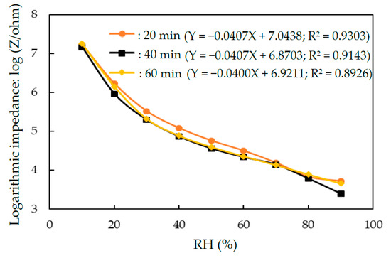 Impedance versus relative humidity for humidity sensors that were made of Ag MWs (6 mg)/PPy (0.1 g)/SnO2 under various time of the UV-irradiation photopolymerization.