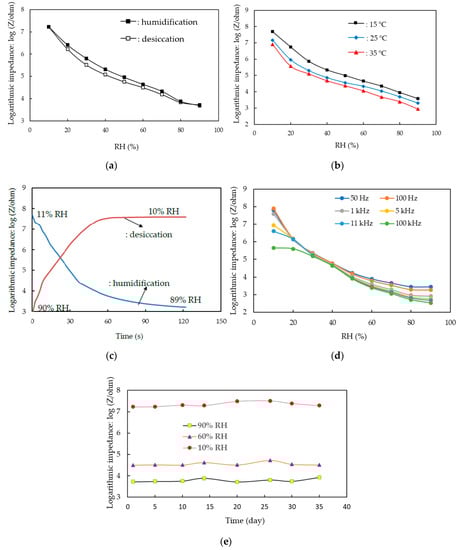 Humidity-sensing properties of the humidity sensor that was made of Ag MWs (6 mg)/PPy (0.1 g)/SnO2 ternary composite film. (a) Hysteresis of the sensor, (b) effect of ambient temperature on the response of the sensor, (c) response/recovery times of the sensor, (d) effect of applied frequency on the response of the sensor, (e) long-term stability of the sensor.