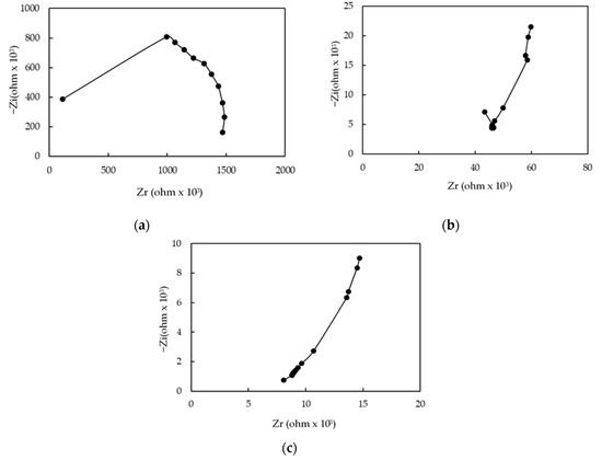 Complex impedance plots of humidity sensor that was made of Ag MWs (6 mg)/PPy (0.1 g)/SnO2 ternary composite film at (a) 20% RH, (b) 40% RH, and (c) 80% RH.