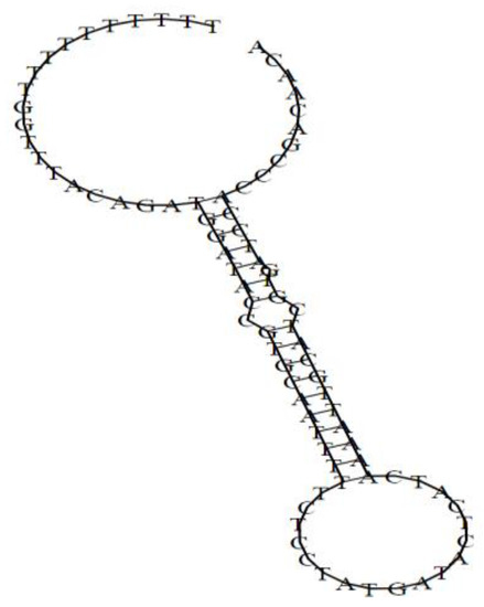 The chemical structure of microRNA-363, obtained using the RNAfold web server (http://rna.tbi.univie.ac.at/), is shown in Figure 1. The thermodynamic characteristics of this centroid secondary structure are as follows: The free energy of the thermodynamic ensemble is—18.11 kcal/mol; the frequency of the MFE structure in the ensemble is 1.45%; the ensemble diversity is 13.85.