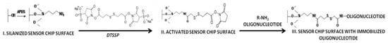 Prior to the immobilization of the molecular probes, the sensor chip surface was activated with DTSSP. The latter represents a homobifunctional crosslinker, whose linear molecule bears NHS-ester functional groups at both ends [36]. DTSSP is a water-soluble analogue of dithiobis (succinimidyl propionate). The solubility of DTSSP in water is provided by the presence of sulfo groups in its structure [36] (Figure 2). Homobifunctional crosslinkers, bearing NHS-ester functionality, are commonly employed for a single-step covalent attachment of proteins via their amine groups [36].