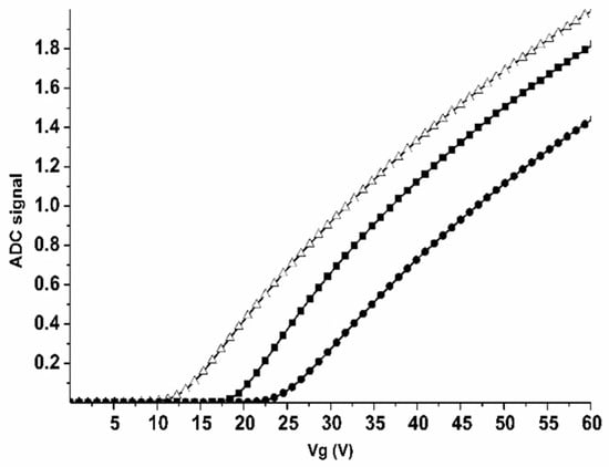 Estimation of the efficiency of the sensor surface functionalization. Typical Ids(Vg) curves obtained for the nanowire sensor #1 (with n-type conductance) before and after each functionalization step: For the unmodified nanowire before its silanization (∆); for the silanized nanowire without immobilized oDNA probes (■); for the sensitized nanowire after the immobilization of oDNA probes onto its surface (●). The curves were recorded in the volt-ampere characteristics measurement mode in water. Abbreviations: ADC—analog-to-digital converter.