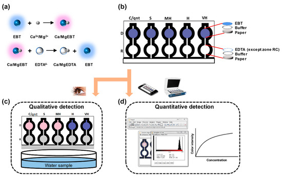 Schematic of the microfluidic paper-based analytical device (µPAD) for the detection of the total hardness of water. (a) The principle of the complexometric titration reactions; (b) the multi-layered deposition of the analytes on the µPAD; (c) the qualitative detection of the total hardness of water; (d) the quantitative detection of the total hardness of water.