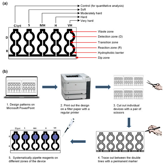 The structure of the μPAD was designed using the Microsoft PowerPoint 2019 software. The design (Figure 2a) contains five detection (D) and reaction zones (R): four for the different classes of water hardness, including soft (S), moderately hard (MH), hard (H), and very hard (VH) and one for a control (C) section that is used for the quantification. A channel links each reaction zone to the detection zone called the transition zone. There is also a dip zone which is the part of the device that is inserted into the water sample for the testing procedure. A channel also exists which connects the dip zone to the reaction zone. On top of the detection zone, there is a waste zone which aids in reducing the elution time [44]. The boundaries of the device were designed with a doubled line in order to give space for the application of the permanent marker for creating the hydrophobic barriers. Afterward, the design was printed on the Whatman Grade 4 filter paper (A4 paper dimension) with a Hewlett-Packard LaserJet P4015× Printer, using the EconoMode printer setting (Figure 2b). The diameter of both the detection and the reaction zone was 0.7 cm. The length and width of the transition zone were 0.54 cm and 0.1 cm, respectively. The waste zone had a length and width of 0.2 cm and 0.1 cm, respectively. Overall, the device had a dimension of 15.88 cm × 12.7 cm.