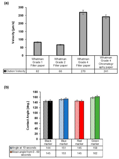Optimization of the paper-based analytical device’s fabrication with respect to the paper type and marker color. (a) The elution velocity of distilled water in different grades of paper. (b) The contact angle measurement over time for the black marker, blue marker, red marker, and green marker on Whatman® Grade 4 filter paper on exposure to drops of HPLC grade water (slanted shade is measurement at 10 s and full color shade is mean measurement over 60 s). Each bar represents the mean of the three individual experiments ± standard deviation.