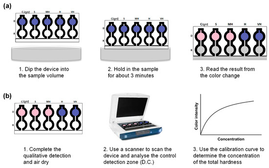 Previously, µPADs have been reported for the semi-quantitative analysis of the total hardness of water using the chelate titration as the detection method [22]. Nonetheless, the proposed approach here provides a number of advantages: (1) the dip-and-read lateral flow design makes the device ready-to-use, eliminating the need for any auxiliary equipment such as volume-calibrated pipettes or droppers; (2) the design based on the WHO classification makes it easier for the final consumer to readily determine how high the total hardness of water is; and (3) the inclusion of a control zone in the design allows for the quantification of the total hardness of water for more accurate analysis.