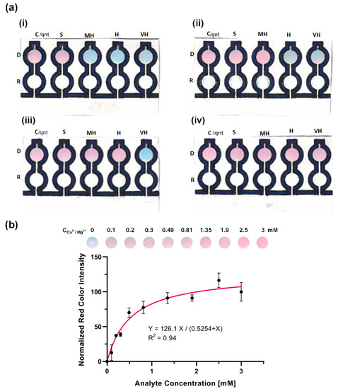 The results of the qualitative detection of the total hardness of water are shown in Figure 6a. The device was dipped into the water samples at room temperature, and the color changes were observed in the detection zones after ~3 min. For the spiked water sample of a concentration 0.49 mM CaCO3 equivalent (Figure 6a-i), the zones D.C. and D.S. turned pink while the remaining detection zones stayed blue. This observation showed that the water was soft, and the result was in accordance with the expectation. For the moderately hard water detection (Figure 6a-ii), a 0.81 mM spiked sample of CaCO3 equivalent was used, and the zones D.C, D.S., and D.MH. turned pink. This moderately hard water also mimicked the expectation. For the classified hard water detection (Figure 6a-iii), a 1.35 mM spiked sample of CaCO3 equivalent was used, and the expectation was for the zones D.C., D.S., D.MH. and D.H. to turn pink. The result of the actual device mimicked the expectation perfectly. This favorable result worked well for the very hard water detection as well, as shown in Figure 6a-iv using 2.5 mM spiked sample of CaCO3 equivalent total hardness. The perfect synchronization between the expectation and the actual device’s results proved that the device could qualitatively determine the total hardness of water using the classification given by the World Health Organization.