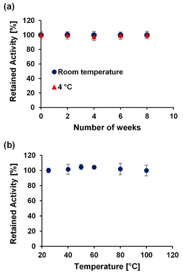 Stability test on µPAD at varying time intervals and conditions. Retained activity of the test kit (a) over a period of 2 months (8 weeks) at room temperature and at 4 °C and (b) after 20 min at varying temperatures from 25 °C to 100 °C. Each data point is the mean of the three individual experiments ± standard deviation.