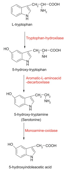 The schematic presentation of serotonin synthesis starting from L-tryptophan and the degradation of serotonin to 5-hydroxyindolacetic acid is presented in Figure 1.