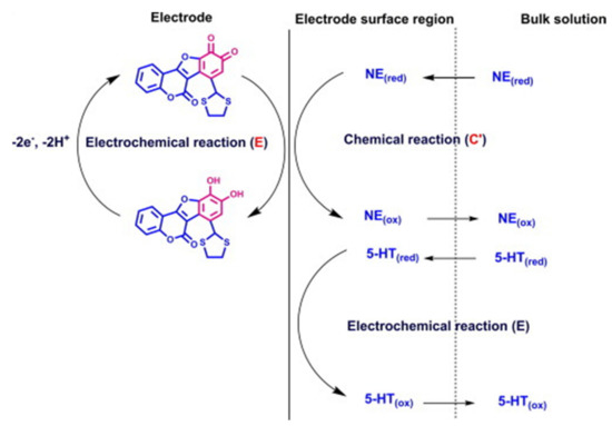An electrocatalytic behaviour for NE oxidation on the IL-DC-CNT/GC surface could through the electrochemical–chemical (EC) catalytic mechanism. In this scheme, NE is oxidized in the catalytic chemical reaction (C’) by the oxidized form of 7-(1,3-dithiolan-2-yl)-9,10-dihydroxy-6H-benzofuro[3,2-c]chromen-6-one (DCox), this product being obtained through an electrochemical (E) reaction. As a result, NE is oxidized at a potential of 180 mV on the IL-DC-CNT/GC surface, while the same NE is oxidized at a potential of 400 mV on the unmodified electrode. The detection process takes place is the same way for serotonin.
