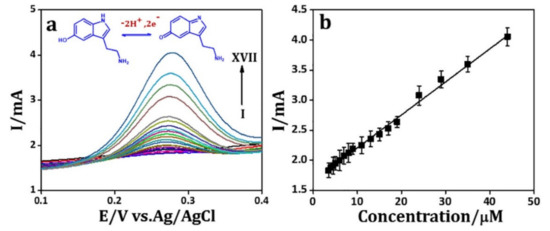 (a) Differential pulse voltammograms of the poly(3,4-ethylenedioxythiophene) (PEDOT)/reduced graphene oxide (rGO)/silver nanoparticles (Ag NPs)/GCE sensor immersed in a solution of serotonin of different concentrations: (I) 0.4 µM, (II) 0.6 µM, (III) 0.8 µM, (IV) 1 µM, (V) 1.8 µM, (VI) 2.0 µM, (VII) 2.4 µM, (VIII) 3.2 µM, (IX) 4.0 µM, (X) 6.0 µM, (XI) 8.0 µM, (XII) 10 µM, (XIII) 15 µM, (XIV) 25 µM, (XV) 29 µM, (XVI) 35 µM, (XVII) 44 µM. The electrolyte was phosphate buffer solution (PBS) of pH 7.4. The inset figure shows the electrochemical oxidation of serotonin. (b) Linear relationship between the peak current and serotonin concentration. Reprinted from [108] with permission of publisher.