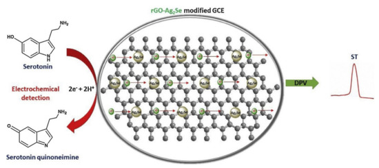 The size of nanoparticles was assessed to be about 60–70 nm by high-resolution electron transmission microscopy (HR-TEM). In the absorption spectrum of rGO-Ag2Se in the UV range, a maximum was observed at 258 nm. X-ray diffraction (XRD) confirmed the amorphous character of rGO and the crystalline structure of Ag2Se nanoparticles. The surface of the glassy carbon electrode (GCE) was modified with rGO-Ag2Se and studied by means of cyclic voltammetry and electrochemical impedance spectroscopy. A clear anodic peak related to serotonin oxidation was observed both by cyclic voltammetry and by differential pulse voltammetry. Cyclic voltammetry proved that rGO facilitates electron transport and hence the increase in the redox peak current. By means of electrochemical impedance spectroscopy, it was found that the resistance of the transfer velocity of rGO-Ag2Se is 81.3 Ω and also the existence of electron transfer facilitation at the level of rGO-Ag2Se/GCE. In optimal conditions, rGO-Ag2Se/GCE has good sensitivity for serotonin detection, and the sensor’s response is directly proportional to serotonin concentration within the range 0.1 to 15 µM with a detection limit of 29.6 nM. The sensor manufactured in this study has good stability (18 days), high selectivity and satisfactory results on real samples, being a useful tool in diagnosing illnesses associated to abnormal serotonin release [109].