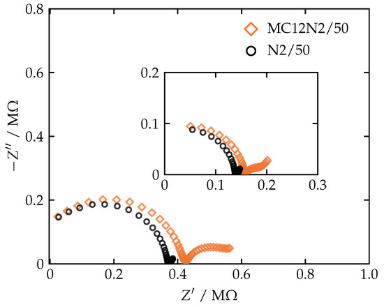 Impedance spectra of sensors with either the best-performing ion-selective membrane or its corresponding control membrane. PVC-shelled sensors are shown in the main plot and PCTFE-shelled sensors in the inset. Measurements were performed in sodium acetate with the parameters , , and . See Table 1 for membrane compositions.