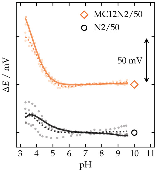 pH sensitivity of sensors with either the best-performing ion-selective membrane or its corresponding control membrane. Polynomials () fitted to the results of PVC- and PCTFE-shelled sensors are shown as solid and dotted lines, respectively. Measurements were performed in acetic acid titrated with a mixture of NaOH and sodium acetate. See Table 1 for membrane compositions.