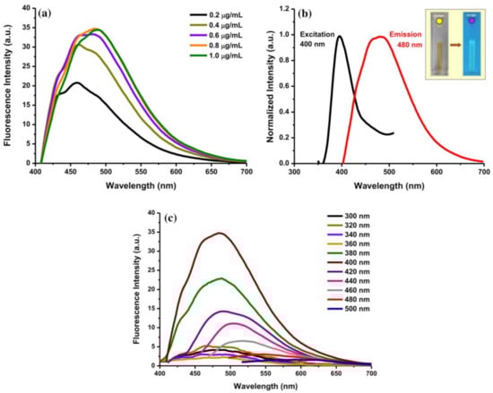 The fluorescence emission spectra of DBPhen were measured. Figure 1a depicts the fluorescence emission spectra of DBPhen excited at 400 nm with different concentrations of DBPhen ranging from 0.2 to 1.0 µg/mL. The relative highest emission peak of DBPhen was observed at concentrations of 0.8 and 1.0 µg/mL. By increasing the DBPhen concentration, the emission peak center was slightly moved to a longer wavelength. The emission peak center was likely to depend on DBPhen’s concentration, and the intensity increased with increasing concentration. However, once the concentration increases so much that DBPhen’s absorbance becomes significant, the absorption of light will affect the emission spectrum. The primary rationale for the emission shift is the formation probability of molecular clusters/aggregates. In the case of a molecular system, aggregation-induced emission (AIE) and aggregation-caused quenching (ACQ) are the two notable occasions that happen in a lot of the organic molecules, resulting in enhancement and quenching of fluorescence intensity, respectively []. Several molecules showed aggregation-induced red-shifted emission (AIRSE). The presence of red-shifted and enhancing emission intensity at ~480 nm with an increase in DBPhen’s concentration produced the J-aggregates in its concentrated solutions []. The aggregation of DBPhen generated in a continuous fluorescence’s red-shift as the concentration increased. Intermolecular forces like dipole–dipole and van der Waals might be responding to this aggregation []. Optical characteristics verify that the concentration-tunable fluorescence is related to DBPhen’s aggregation, resulting in the continuous red-shift in fluorescence emission. In addition, Figure S4 shows the fluorescence excitation (FLE) features of the DBPhen compound. FLE intensities of DBPhen at 400 and 650 nm increased gradually with its increasing concentration, while intensities at 250, 290, and 315 nm decreased with the increasing concentration of DBPhen.