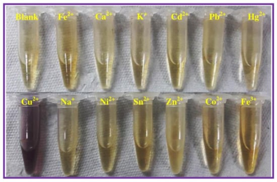 The detection of heavy metals in environments, biological systems, and foods is highly significant for human health and life safety []. The recognition of biologically and chemically notable metal ions and their harmful impacts on the human body and the ecosystem has remained much a research concern []. Copper (Cu) is an essential trace element in life and plays a significant role in chemical, biological, and environmental areas []. A specific level of copper ions (Cu2+) in the human body can provide the energy required for catalytic reaction and assist in keeping and improving the function of artery and heart tissues []. However, an extra Cu2+ level in the human body may induce severe neurodegenerative diseases, including Parkinson’s disease, Alzheimer’s disease, Menkes syndrome, and Wilson disease [,,]. Besides, Cu2+ ions are nonbiodegradable and naturally accumulate in the food chain, which poses a critical threat to the environment and human health. Hence, the detection of Cu2+ is still a necessary topic in environmental and biological analyses.