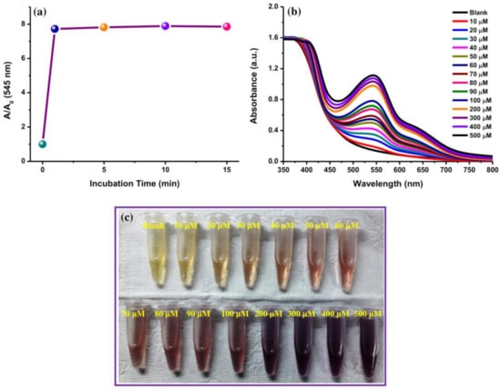 The impact of mixing time on the reaction between DBPhen and Cu2+ was initially monitored via the UV-VIS absorption spectra of the DBPhen/Cu2+ complexes (Figure 5a). It can be observed that the reaction between DBPhen and Cu2+ was rapid and complete with 1 min of both mixing and incubation durations. To further examine the sensitivity to recognize Cu2+ ions, the UV-VIS absorption spectra of the DBPhen solutions with various levels of Cu2+ (10–500 µM) were measured (Figure 5b). It can be seen that the peak at ~545 nm enhanced progressively by increasing the level of Cu2+, indicating the forming of DBPhen/Cu2+ complexes with a change of color from yellow to purple. The purple color of the solution was enhanced by increasing the level of Cu2+ (Figure 5c).