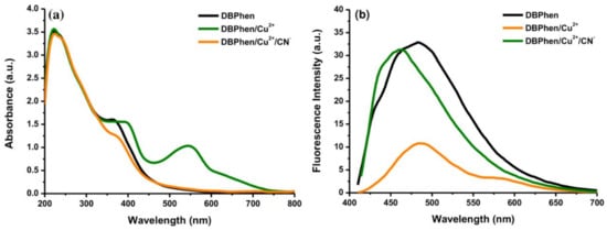 (a) UV-VIS and (b) fluorescence spectra of DBPhen (black), DBPhen/Cu2+ (green), and DBPhen/Cu2+ after the addition of CN− (orange). The concentrations of Cu2+ and CN− were 500 and 1000 µM, respectively.