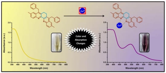 In this work, we reported DBPhen as a simple colorimetric sensor for Cu2+ with UV-VIS spectroscopy to monitor a new absorption peak of the DBPhen/Cu2+ complex. The results show that the recognition of Cu2+ can be obtained by color and UV-VIS spectral changes, which has a tremendous antidisruption capability for general metal ions in environments. Cu2+ ions induced a noticeable color change of DBPhen at a visible spectrum of ~545 nm. The color change from yellow to purple actualizes the naked eye recognition with a prospective application value. Additionally, the yellow color was restored by introducing CN− to the complex. Fluorescence quenching of the DBPhen/Cu2+ complex also confirmed the restoration of the emission intensity after adding CN−. As far as we know, this work is the first report on the utilization of DBPhen as a colorimetric sensor for recognizing Cu2+ in aqueous solution. Some bits of information, such as the selectivity, sensitivity, restoration, and sensing mechanism, were provided and discussed to improve new great achievement sensors.