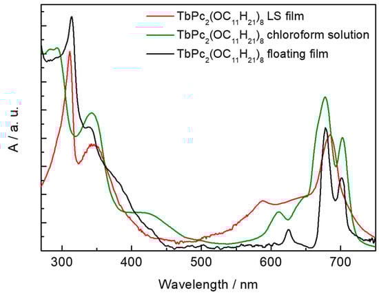 UV-VIS electronic absorption spectra of the TbPc2(OC11H21)8 macrocycle as floating film, in chloroform solution and in L-S thin film form deposited onto silica glass substrate.