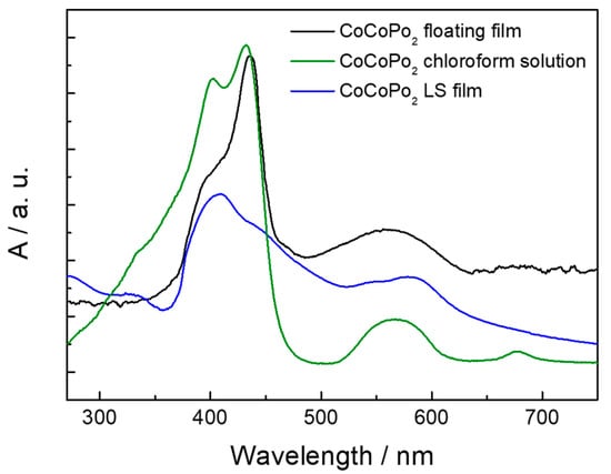 UV-VIS electronic absorption spectra of the CoCoPo2 macrocycle as floating film, in chloroform solution and in L-S thin film form deposited onto silica glass substrate.
