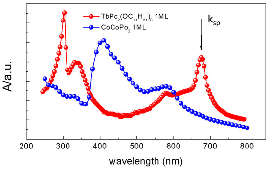 UV-VIS electronic absorption spectra comparison of TbPc2(OC11H21)8 and CoCoPo2 monolayer deposited onto silica glass substrate. The position of the transducers surface plasmon resonance energy coupling with electronic transition of the TbPc2(OC11H21)8 is evidenced.