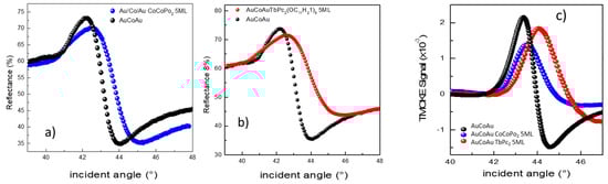 (a,b) Experimental reflectivity curves (SPR) vs. angle of incidence of TbPc2(OC11H21)8 and CoCoPo2 macrocycles. (c) Magneto-plasmonic curves (TMOKE signal) of Au/Co/Au transducers covered by 5 monolayers (5ML) of TbPc2(OC11H21)8 and CoCoPo2, respectivley.