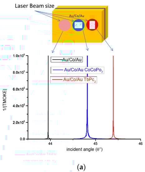 (a) 1/|TMOKE| signal vs. incidence angle of the Au/Co/Au transducer alone compared with the same signals acquired in the presence of a single monolayer of CoCoPo2 and TbPc2(OC11H21)8 macrocycles. The coloured circles represent the investigating laser size (<0.5 mm). (b) 1/|TMOKE| signals vs. incidence angle in Kretschmann configuration for CoCoPo2 and TbPc2(OC11H21)8 monolayers interacting with butylamine vapours, respectively.
