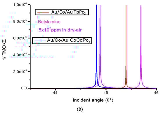 In both cases the magneto-optical TMOKE signal probes are characterized by a sharp resonance like angular behaviour at around 45°, i.e., when the SPP is excited, but the experimental effects are significantly different in terms of simple resonant schift and dept of the resonant curve. The resonant angle θMOSPR corresponding to the activation of MOSPR signal is more precisely visualized by plotting the quantity 1/|TMOKE|. Plotting the data in this manner makes much easier to visualize the gain in precision and response. In Figure 10a the absolute value of 1/|TMOKE| as a function of the incidence angle θ for TbPc2(OC11H21)8 and CoCoPo2 molecules is reported. The spectra of 1/|MOSPR| reported in Figure 10 evidences a very narrow signal FWHM giving the opportunity to discriminate between the nature of the single monolayer deposited onto the surface of transducer, pointing out at this point the ability of the system to discriminate between molecules with π-π* electronic transitions close to the resonant plasmon or, on the contrary as for CoCoPo2, far away. It also demonstrates the ability of the system to sense unequivocal the presence of five monolayer through a laser spot probe (1 mm in size) and through an high magneto-plasmonic signal, so that we can stress to have taken the road towards the realization of a system with improved molecular sensing also under five monolayers, thus able to monitor even the single monolayer (single molecule layer) deposited onto the MOSPR transducer. Furthermore, we can also demonstrate that in terms of VOCs sensing capability comparison between the two configuration, Figure 10b puts in evidence the sensing responses in term of 1/|TMOKE| signal when the sensing molecules are in contact with a typical VOC like butylamine. The rationale is that the interactions between VOCs and organic macrocycles are favoured in the case of coupling between resonant plasmons energy and the π free electron of the phthalocyanine ring in comparison with to the decoupling situation relative to the porphyrins, consequently the sensing signal increases.