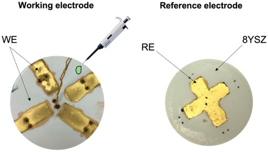 Electrodes were screen printed in a rectangular shape: four Fe0.7Cr1.3O3/8YSZ electrodes on one side of the electrolyte and only one LSM/8SZ on the other side. This configuration is convenient because it consists of a reference electrode for oxygen, which is common, and four different working electrodes for testing different catalytic materials to functionalize the electrode by nanoparticle infiltration. Replacing Pt, which is usually employed as RE [12,13,51,52,53,54,55,56,57], with LSM/8SZ results in a larger triple-phase boundary (TPB). This means an increment in the contact point between electronic and ionic materials and the gas. A screen-printed gold layer was used as the current collector (900 °C for 2 h) on top of the electrodes, while silver paste was employed to assure the attachment of the lead wires to the electrodes.