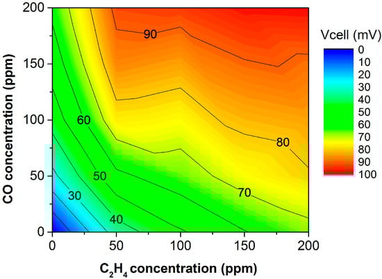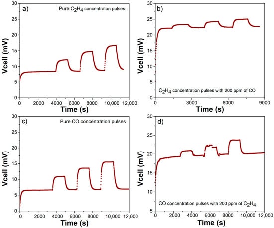 As previously reported, the (catalytically nonactivated) bare sensor response is not specific to C2H4 [41]. The device is exposed to concentration pulses of both pure CO and C2H4 from 50 to 200 ppm for 20 min. Additionally, the device response is measured for the same concentration pulses of one analyte but with a fixed concentration of 200 ppm of the other, as shown in Figure 3. This counter plot helps to summarize the sensor response to both C2H4 and CO. In these plots, the x- and y-directions are CO and C2H4 concentrations, respectively. The colormap indicates the voltage response offered by the sensor when exposed to a given concentration of analytes. Thus, a device selective to C2H4 must show an increase within the y-direction, with its response in the x-direction remaining constant. Figure 3 and Figure 4 display how the response to both C2H4 and CO is similar, and therefore, the C2H4 electrochemical reaction is not favored. As observed in Figure 3, the lines of constant potential are diagonal, increasing from left to right. This confirms the lack of selectivity to C2H4. Figure 4 shows the transient response for different scenarios with C2H4 and CO, confirming similar responses. This indicates a high cross-sensitivity toward CO, and therefore, the device is unable to measure C2H4 in an exhaust-gas-like atmosphere.