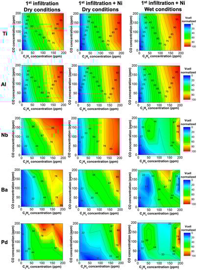 Therefore, the working electrode should be catalytically activated to promote the electrochemical reaction of C2H4. Several catalyst nanoparticles are infiltrated into each channel to achieve this promotion of the C2H4 reaction rate. As several channels are measured, the response is normalized to enable comparison. After the infiltration of nanoparticles in dry conditions, it was found that Ti and Al led to an increase in the electrochemical reaction of C2H4 (Figure 5). Thus, this reaction is kinetically favored. It should be noted that the response to C2H4 is not affected by the addition of 200 ppm of CO. Thus, the device is able to detect C2H4 even in the presence of CO. On the other hand, Nb, Ba, and Pd infiltration provide a poorer response in dry conditions. Despite improving the response in comparison to the bare sensor, the cross-sensitivity toward CO is too high, albeit for C2H4 detection purposes (Figure 5).