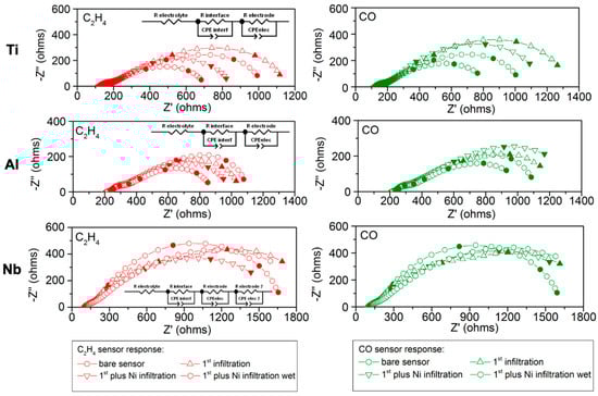 Electrochemical impedance spectroscopy was performed for each one the five infiltrated elements, exposing the device to 200 ppm of pure CO and C2H4. The EIS measurement procedure is as follows: first the bare sensor, then with the addition of the first element, and finally for the first element plus Ni in dry and wet conditions.