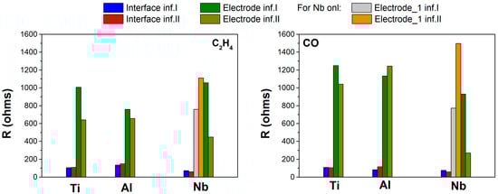 Fitting results for the first infiltration with each element (blue and green) and second infiltration with Ni (red and brown). Resistances related to interface and electrode processes are calculated. On the left side, C2H4 response is depicted, while on the right side, the response to CO is depicted. In the case of Nb, an additional electrode contribution appears (gray and yellow). The maximum chi-square values obtained in the fitting of each element are: 1.5 × 10−4 for Ti, 1.7 × 10−4 for Al, and 4.59 × 10−6 for Nb.