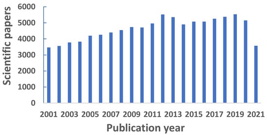 Yearly statistics of scientific papers published between 2001 and 2021 in the research area of laser-induced fluorescence.
