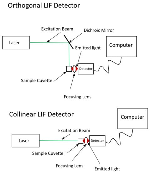 In addition to advances in available parts, other advances in technology, especially separation technologies, have necessitated integration with LIF detection [130]. Common technologies include, but are not limited to, high-performance liquid chromatography, CE, microfluidics, and flow cytometry [131,132,133,134,135]. Most of these integrations simply involve the replacement of a standard cuvette with a flow cell (or in the case of CE, a section of optical window along the capillary) after the separation [136]. However, this is not the only way to do it, especially when improvements like sheath flow hydrodynamic focusing is adapted [137].