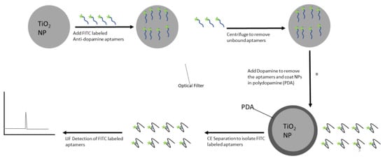 There has been an increase in the use of MONPs in the fluorescent detection of other molecules, which in many cases can be altered and used as a means of detecting the nanoparticles themselves [204]. For instance, Venkatesan et al. [205] attempted to use ZnO nanoparticles as a means of detecting picric acid and found that their fluorescence increased dramatically. Thus, by extension, picric acid can be used to detect ZnO nanoparticles [205]. Similarly, by attaching a silane linker and the fluorescent dye to TiO2 nanoparticles for cell imaging, Kokot et al. [206] found this strategy to be applicable to detection of the nanoparticles in water samples. Finally, Zhou et al. [207,208] used fluorescently labelled DNA aptamers for the detection of specific species (e.g., Ochratoxin A and Aflatoxin B) in food samples. In their work, the aptamers were not chemically bonded to nanoparticles, making them easily detached in the presence of the target species as the three dimensional shape assumed by the aptamers allowed them to overcome their adsorption onto the nanoparticles, resulting in a lower fluorescence quenching effect for the development of a sensitive detection method. Our laboratory has developed a similar detection method for TiO2 nanoparticles involving coating with fluorescein isothiocyanate (FITC) labelled anti-dopamine DNA aptamers, as illustrated in Figure 3. In this method, fluorescently labeled aptamers are adsorbed onto nanoparticles, unbound aptamers are removed, and bound aptamers are removed by adding their target, separated, and detected by LIF in order to determine the concentration of nanoparticles in the sample.