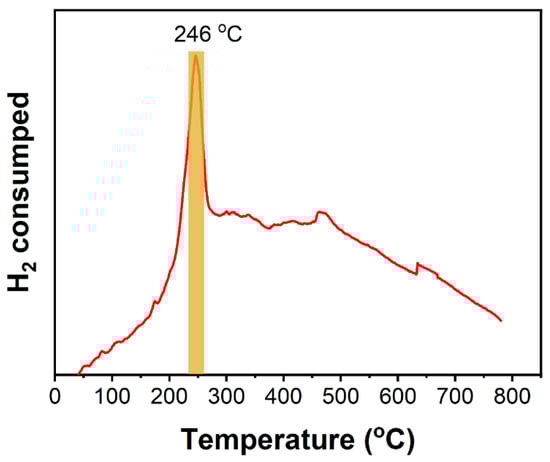 The reducibility of Cu-based catalysts was analyzed by temperature-programmed reduction (TPR), as shown in Figure 1. There was a strong peak at 245 °C which could have resulted from the reduction of CuO []. Therefore, the Cu-based catalyst could have reduced at 250 °C in the H2/Ar atmosphere during the CNCs’ fabrication. The growth of the CNCs could be attributed to the Cu0 or the Cu+. The Cu+ could be attributed to the active species for the growth of CNCs because the Cu+ will have been further reduced to Cu0 by the hydrogen reduction resulting from the acetylene’s decomposition at the high temperature [].