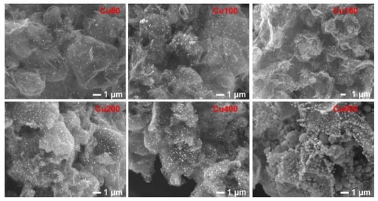 The morphologies of the Cu-based catalysts after reduction at 250 °C were also characterized by the SEM. As shown in Figure 2, the decorated Cu particles were deposited uniformly on the graphene. The Cu nanoparticles were about 50 nm in diameter for the Cu200 catalysts. Furthermore, the diameter of the Cu nanoparticles increased with the increase of the ALD Cu cycles. After 200 cycles of ALD Cu, the Cu nanoparticles increased in number instead of diameter. After further ALD Cu cycles, the diameter of the Cu nanoparticles increased. Furthermore, the nanoparticles maintained their uniform dispersion after 400 ALD cycles. The Cu800 catalysts displayed a non-homogenous dispersion. This could be attributed to the high content of the Cu catalysts and the agglomeration of the Cu nanoparticles. The uniformly deposited Cu catalysts lead to the well dispersed growth of the CNCs.