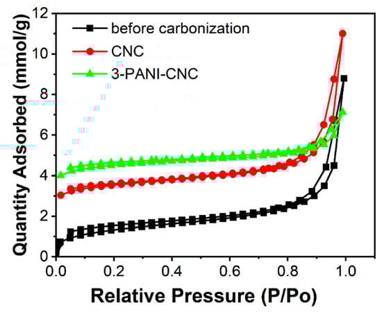 The N2 adsorption–desorption isotherms of the CNCs before carbonization, the CNCs, and the 3-PANI-CNCs are shown in Figure 5. They exhibited typical type IV-shaped isotherms for CNC-based samples, according to the International Union of Pure and Applied Chemistry (IUPAC)’s classification. These were attributed to the physical adsorption of N2 on the CNCs with nonporous nanotube walls. The Brunauer-Emmett-Teller (BET) model was employed for the analysis of the surface areas. The BET surface areas were calculated to be 104.8, 248.4 and 312.3 m2g−1 for the CNCs before carbonization, the CNCs and the 3-PANI-CNCs, respectively. After the decoration of the PANI, the BET surface area of the 3-PANI-CNCs increased compared with that of the CNCs. This was attributed to the mesoporous structure of the ultra-thin layer of the PANI.