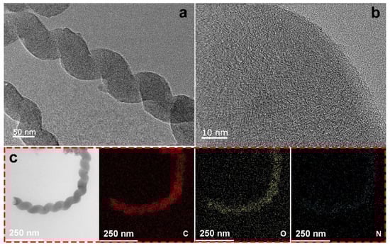 TEM was employed to further investigate the morphology of these CNCs and the decoration of the PANI on the CNCs’ surfaces. As shown in Figure 6, the morphology of the CNCs with a diameter of 50–80 nm was consistent with the SEM results. From the HRTEM image, as shown in Figure 6b, there was no obvious lattice fringe. This could be attributed to the low degree of crystallinity of the CNCs or the amorphous CNCs. As shown in Figure 6c, the HAADF-STEM and EDX (energy-dispersive X-ray spectroscopy, JEOL-2100F microscope, JEOL, Tokyo, Japan) mapping were employed to confirm the decoration of the PANI on the CNCs surface. It was clear that the distribution of the N element was uniform on the surface of the CNCs, confirming the successful decoration of the PANI on the CNCs’ surfaces. The N maintained the morphology of the pristine CNCs. The pale distribution of the N elements belonged to the ultra-thin layer of the PANI.