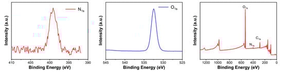 Further confirmation of the decoration of the PANI layer on the CNCs was obtained through the performance of X-ray photoelectron spectra (XPS) to. As shown in Figure 7, the XPS spectra revealed that there were N, C and O on the surface of the 3-PANI-CNCs. The XPS results indicated the successful decoration of the PANI on the surface of the CNCs. As shown in the surface elements analysis spectrum, there were three peaks for O1s, N1s and C1s. There was no Cu peak in the surface elements analysis spectrum, revealing the successful coating of the PANI and the complete removal of the catalysts.