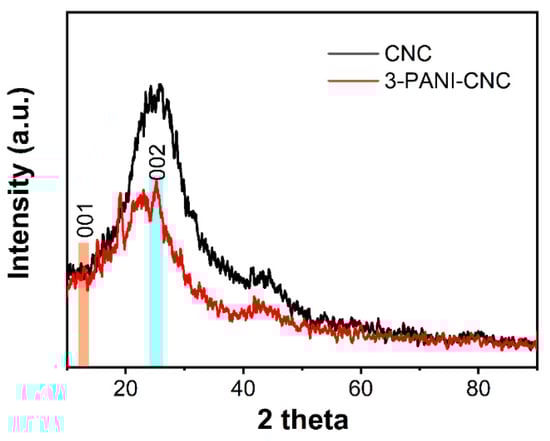 Further confirmation of the crystal structure of the coating of the CNC and PANI-CNC samples was obtained through XRD. As shown in Figure 9, there were two broad peaks in the CNCs’ XRD curves, which was caused by the amorphous structure of the CNCs. The XRD results of the CNCs further verified the HRTEM results. For the 3-PANI-CNC, there were new peaks located at about 12° and 25°, which were attributed to (001) and (002) of the graphitized prism-shaped hollow carbon []. This confirmed that with the deposition of PANI, the 3-PANI-CNCs’ surfaces increased as the new graphitized prism-shaped hollow carbon emerged.