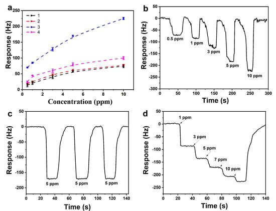 Another key factor is the repeatability of the QCM sensor. As shown in Figure 10c, the sensor was tested three times for its ability to detect 5 ppm formaldehyde. The differences between the response values across the three tests was less than 5 Hz, which reflected the good repeatability of the sensor.
